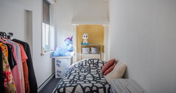 De woning beschikt over twee slaapkamers, waaronder een ruime hoofdslaapkamer met toegang tot het balkon. De tweede kamer is ideaal als kinderkamer of werkruimte.