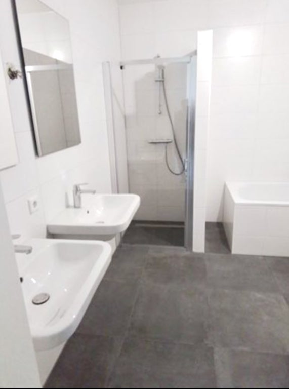 De badkamer en het toilet hebben een mooie stoere grijze tegel, en de vloer is voorzien van laminaat in een warme hout tint.