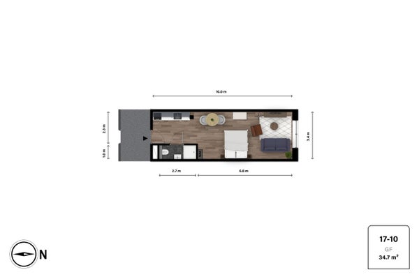 Bij binnenkomst is links de keuken, uitgerust met een koelkast en een inductiekookplaat. Rechts van de entree is de badkamer met douche, wastafel en toilet. Verder in de woning bevindt zich het eet-, woon- en slaapgedeelte.