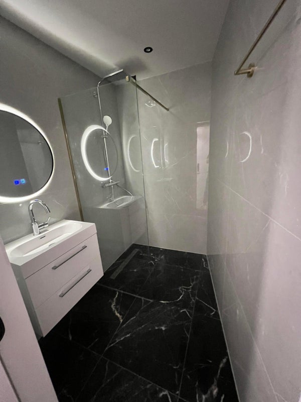 Comfortabel slaapgedeelte, opbergruimte en een gloednieuwe badkamer met inloopdouche, wastafel en eigen wasmachine.