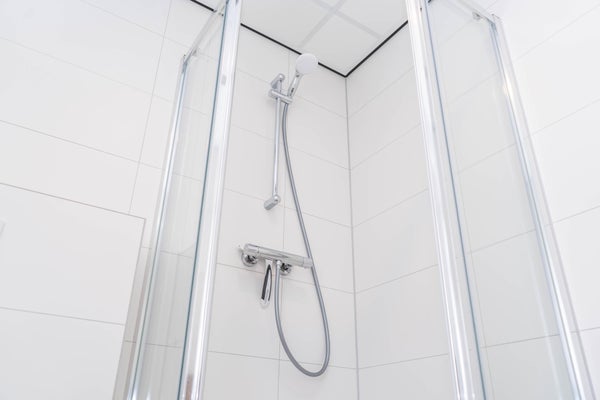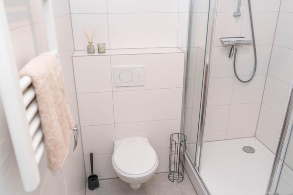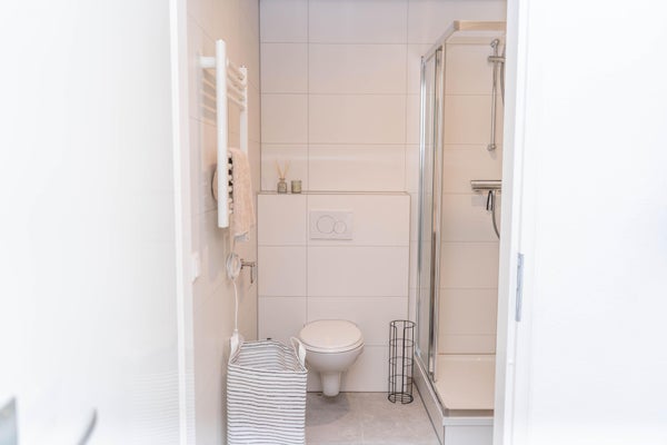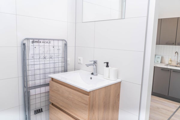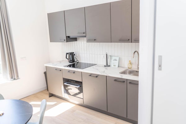 Een comfortabele slaapkamer gecombineerd met je woonkamer, volledig ingericht met een bed, kasten en linnengoed. Luxe badkamer met inloopdouche, strak tegelwerk en modern sanitair.