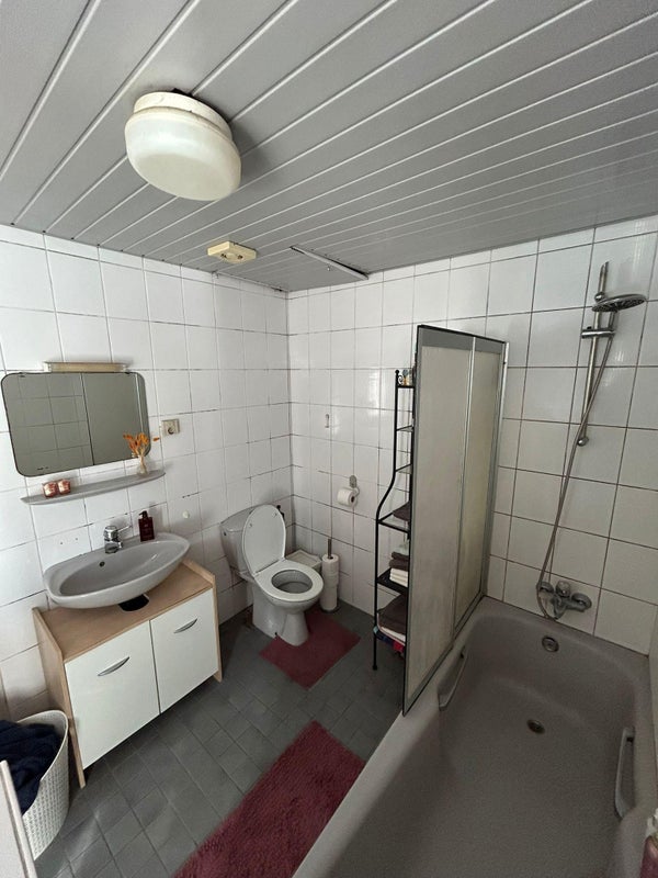 Comfortabele slaapkamer. Moderne badkamer met douche, wastafel en toilet.