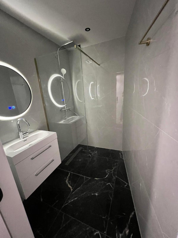 Comfortabele slaapgedeelte, opbergruimte en een gloednieuwe badkamer met inloopdouche, wastafel en eigen wasmachine.
