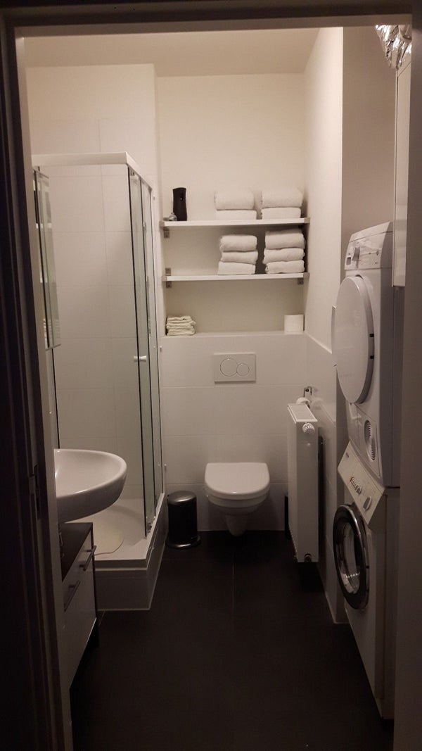 Zeer nette badkamer, welke is voorzien van een douche, wastafel, spiegel, wasmachineaansluiting en toilet.