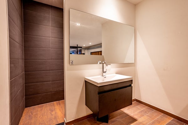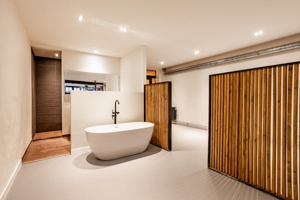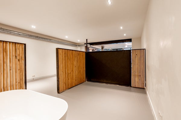 De dubbele glazen deuren leiden je naar de ruime en lichte loft. Het slaapgedeelte beschikt over een moderne badkamer met ligbad, separate douche en wastafel. Er is een apart toilet aanwezig.
