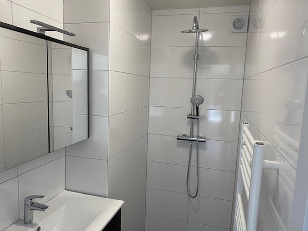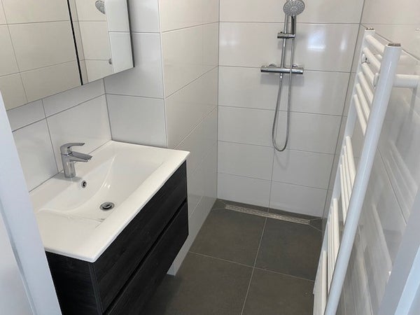 Nieuwe badkamer met inloopdouche, spiegel, mechanische afzuiging en wastafelmeubel. Het eigen toilet bevindt zich in de entreehal.