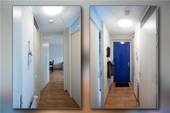 Vanuit de hal heb je toegang tot de woonkamer, de meterkast, slaapkamer en badkamer.