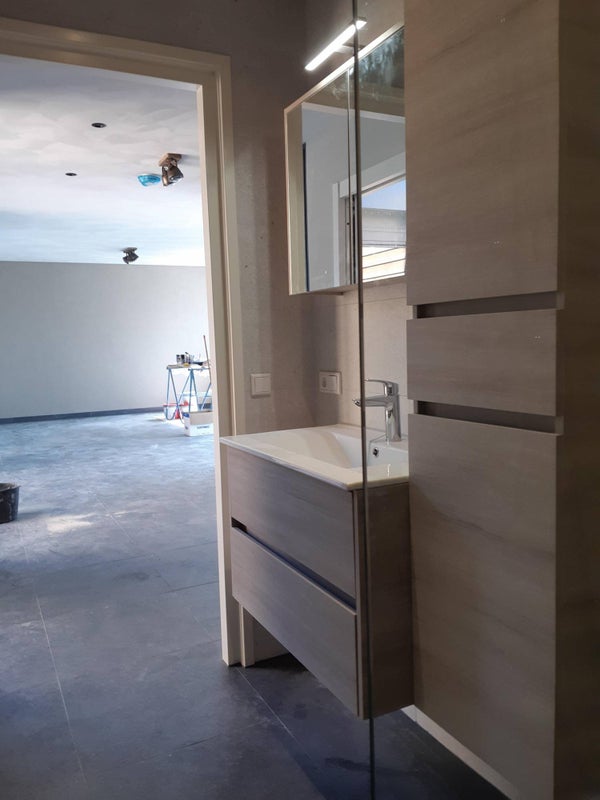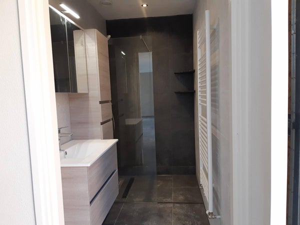 De badkamer beschikt over een ruime inloopdouche, ingebouwde wastafel, handdoekenradiator en kastruimte.