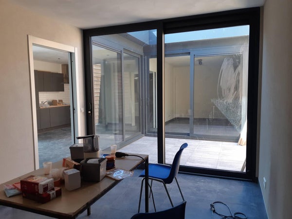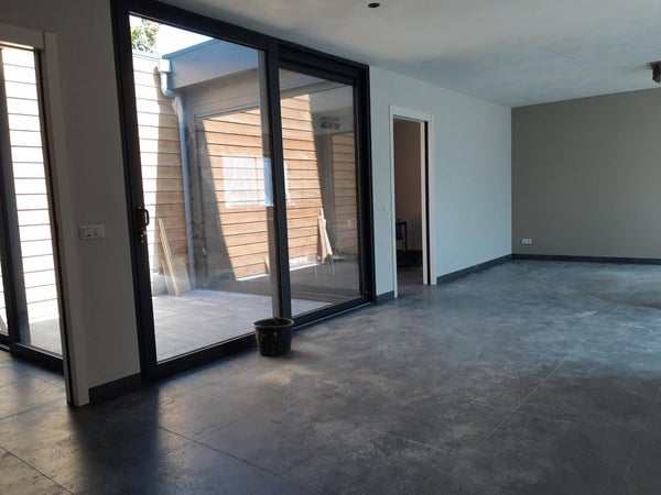 De woonkamer heeft veel lichtinval door de glazen pui, welke ook doorgang geeft naar de patio.
