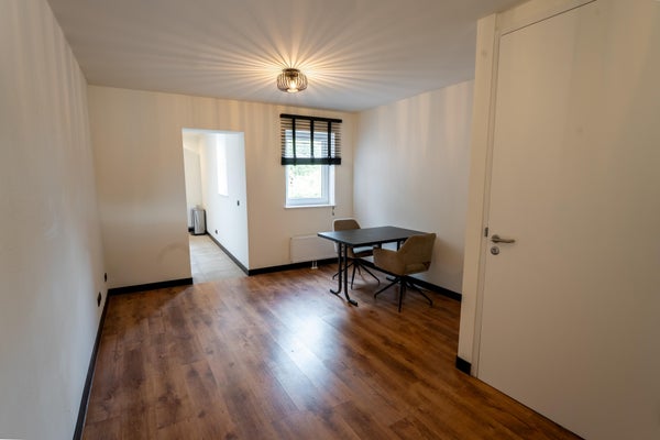 Dit appartement bevindt zich op de tweede verdieping aan de achterzijde van het gebouw. U bereikt de slaapkamer via de trap (naar de vide), die is uitgerust met een boxspring en een nachtkastje. De woonkamer is volledig uitgerust met een laminaatvloer en een prachtig tapijt bij de bank / salontafel.