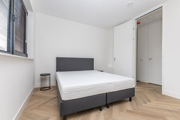Op de tweede etage bevindt zich de ruime slaapkamer met een fraaie boxspring, die door de grote ramen veel daglicht binnenlaat. De slaapkamer biedt toegang tot een prachtig afgewerkte badkamer met een moderne douche en wastafel. Daarnaast beschikt de maisonette over een kleine, maar praktische buitenruimte, ideaal voor een kop koffie in de ochtendzon of een rustige avond.