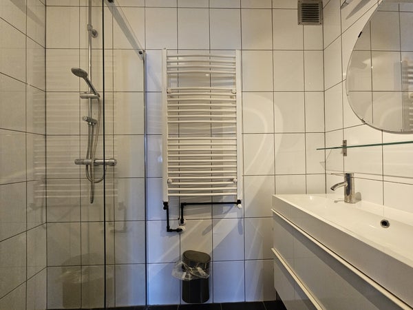 De comfortabele slaapkamer bevindt zich aan de andere zijde van het appartement en biedt directe toegang tot de nette badkamer, voorzien van een inloopdouche en een wastafelmeubel met spiegel.
