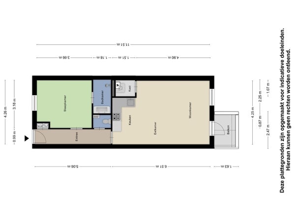 Bij binnenkomst treft u de hal met meterkast en toilet. Vanuit hier heeft u toegang tot de ruime slaapkamer en de gezellige woonkamer met open keuken.