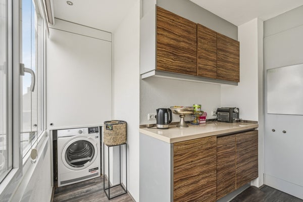 Het appartement beschikt over een ruime entree en hal die toegang biedt tot alle vertrekken. De grote woonkamer heeft een laminaatvloer en geeft toegang tot het balkon. De stijlvolle, olijfgroene semi-open keuken is voorzien van een composietwerkblad, ontbijtbar, combi-oven/magnetron, 5-pits gaskookplaat, brede RVS-afzuigkap, vaatwasser, wasmachine, grote koelkast en vriezer. De moderne badkamer beschikt over een inloopdouche, toilet en dubbele wastafel. Daarnaast zijn er twee royaal bemeten slaapkamers.