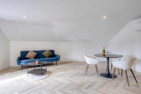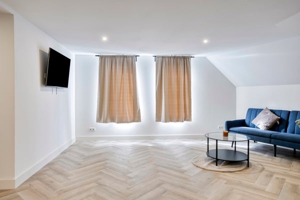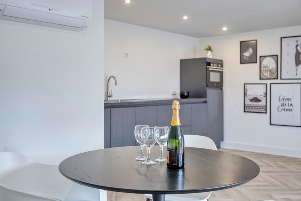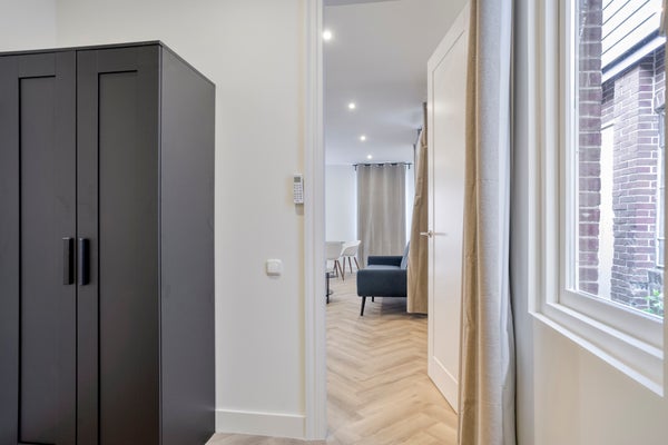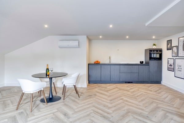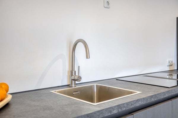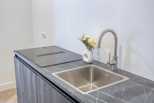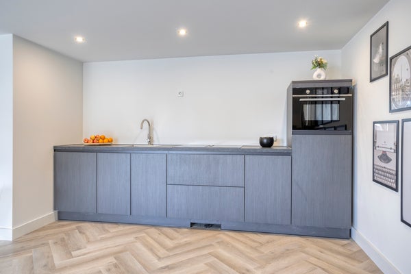 Aan de voorzijde van de woning bevindt zich de woonkamer met zithoek en eethoek, luxe open keuken voorzien van inductiekookplaat met inbouw afzuigkap, koelkast met vriesvak, magnetron, spoelbak met thermostaatkraan. ruime eethoek en smart-TV met moderne bank. Moderne en luxe uitgevoerde badkamer voorzien van vloerverwarming, step-in shower, thermostaatkraan, handdouche en regendouche.