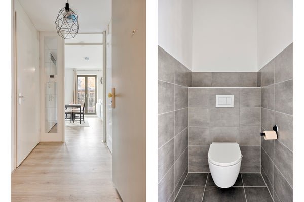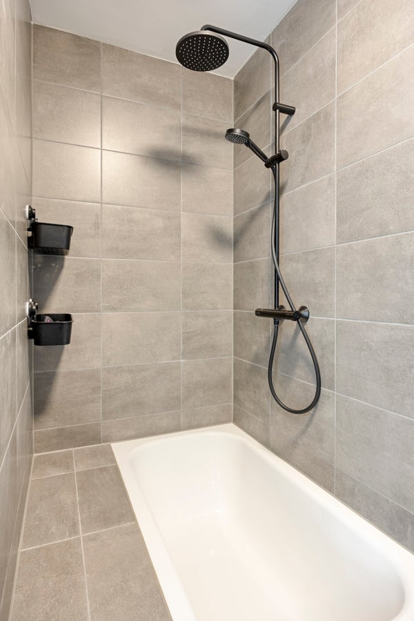 De badkamer is luxe uitgevoerd en beschikt over zowel een inloopdouche als een ligbad, een wastafel met meubel en is afgewerkt met hoogwaardige materialen. Daarnaast is er een separaat toilet aanwezig.