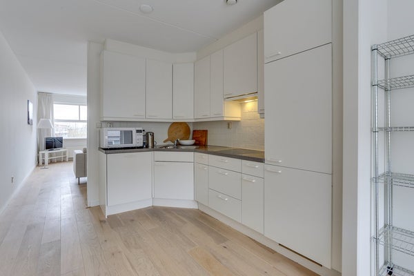 entree/hal met toegang tot 2 slaapkamers (11m2 en 9m2; grootste kamer met ruime ingebouwde kledingkast). Verder is in de hal toegang tot extra kledingkasten, opbergkast, meterkasten, ruimte voor wasmachine en wasdroger, toilet met fontein en badkamer met ligbad, aparte douche en wastafel. De ruime (25m2) en zeer lichte woonkamer biedt een vrij uitzicht en geeft toegang tot het balkon op het zuiden. Aangrenzend aan de woonkamer is de eetkamer (17m2) en open keuken met (inbouw)apparatuur te weten: keramische kookplaat, magnetron, afzuigkap, koelkast, vriezer, vaatwasser. Het gehele appartement is voorzien van een lichte lamelparket vloer.