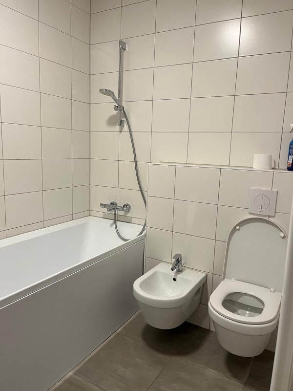 Moderne badkamer met dubbele wastafel, ligbad, toilet en bidet, plus een apart extra toilet voor extra gemak
