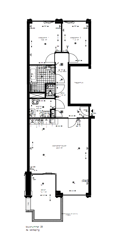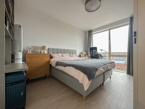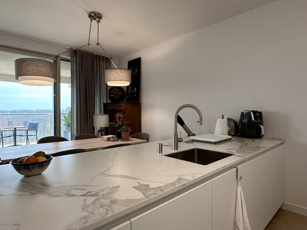 Toegang tot de hal met de meterkast, toilet en extra berging met de wasmachine en de droger. De ruime woonkamer heeft een zeer royale open keuken met een eiland. De keuken is voorzien van alle inbouwapparatuur zoals een koelkast, inductie kookplaat met interne afzuiging, 2 combi/ovens, spoelbak en vaatwasser. Via de schuifpui kom je op het balkon met een heerlijk vrij uitzicht over de skyline van Utrecht.