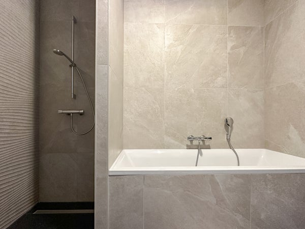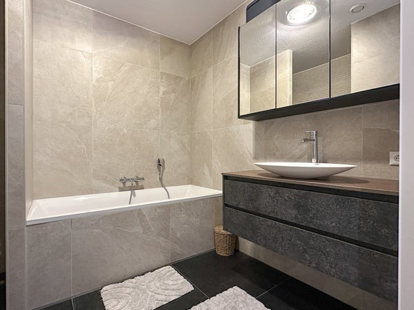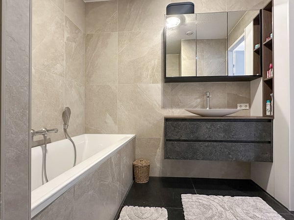 De badkamer is voorzien van een luxe inloopdouche, ligbad en er komt nog een wastafelmeubel met 2 waskommen en lades. Het Energielabel is A+++