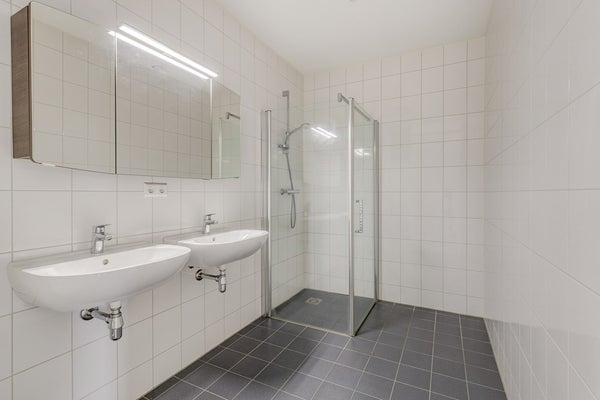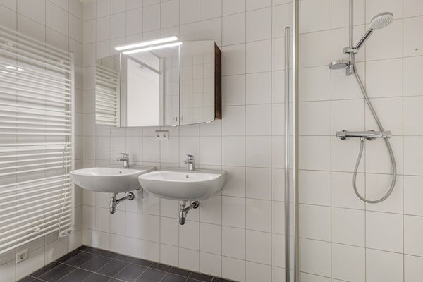 Daarnaast vind je de ruime badkamer, voorzien van twee wastafels en een douchecabine.