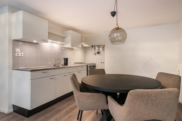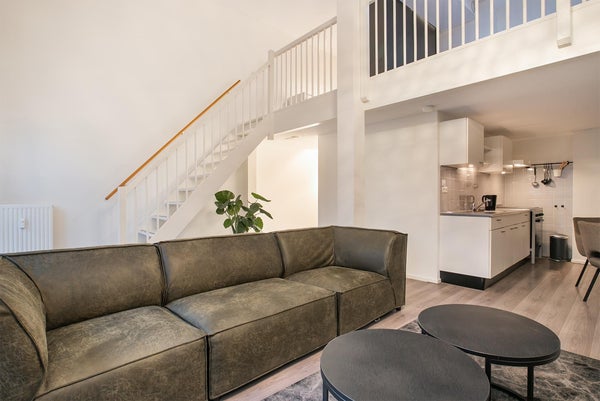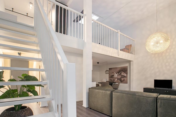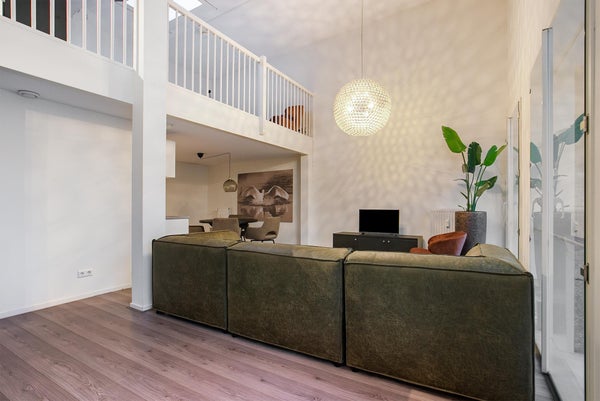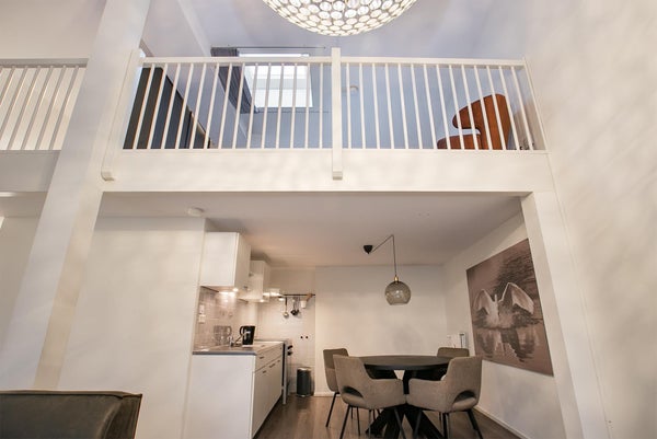 Een mooi en licht appartement bestaande uit een ruime woonkamer met open keuken, een badkamer en een vide verdieping bestaande uit een slaapkamer.