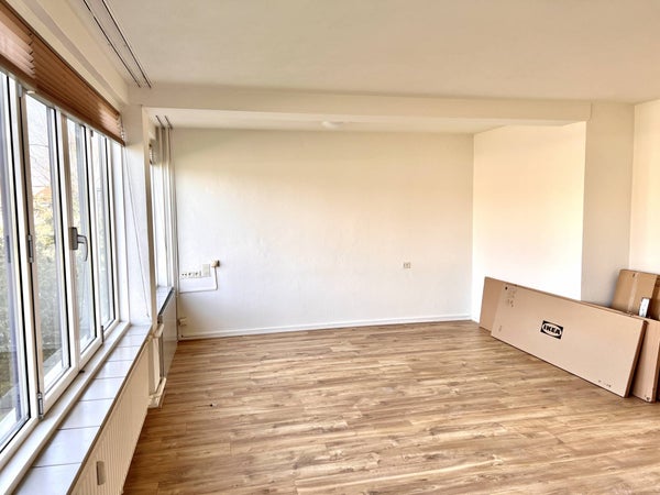 Entree/hal, toegang naar de nieuwe keuken met inbouwapparatuur, kookplaat, afzuigkap, koelkast en vriezeren vaatwasser. Zeer ruime L-vormige woonkamer met grote ramen en heerlijk uitzicht over het plantsoen met waterpartij en toegang naar het zonnige balkon op het westen.