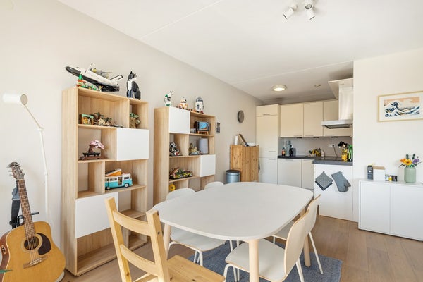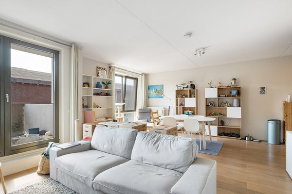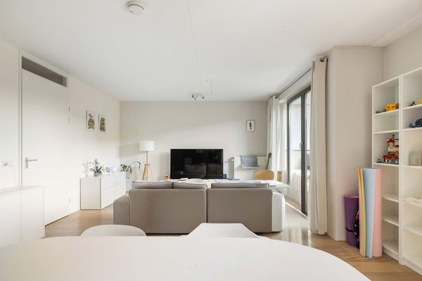 De ruime woonkamer is gesitueerd aan de voorzijde van het pand en heeft grote raampartijen die zorgen voor veel daglicht. Dankzij de L-vorm is de ruimte efficiënt in te delen in een zit- en eetgedeelte. Vanuit de woonkamer is toegang tot het zonnige balkon op het zuiden.
