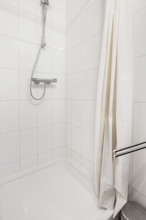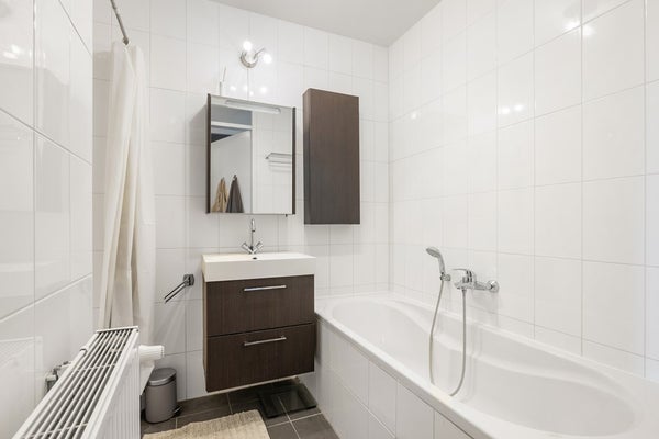 Centraal in de hal bevindt zich de badkamer, welke is uitgerust met een ruime douche, ligbad en wastafel met modern badkamermeubel. Daarnaast is er een separaat toilet aanwezig. Ook is er een praktische inpandige berging met wasmachineaansluiting.