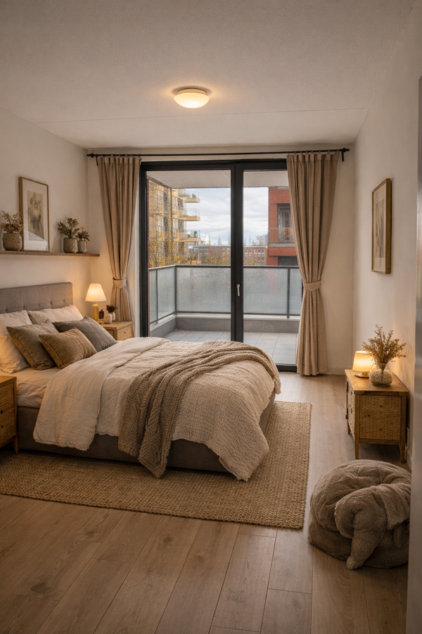 Ook kom je vanuit de hal in de slaapkamer die ook weer toegang geeft tot het balkon.