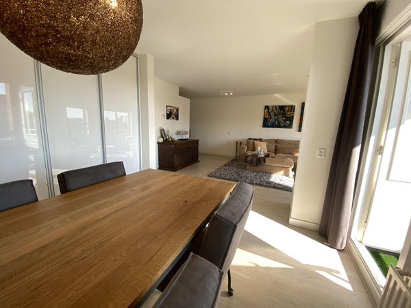 - Ruime woonkamer (50m2), met open keuken voorzien van diverse luxe Siemens inbouwapparatuur, leefgedeelte en eetkamer. De eetkamer beschikt over een grote vaste kast met veel extra opbergruimte