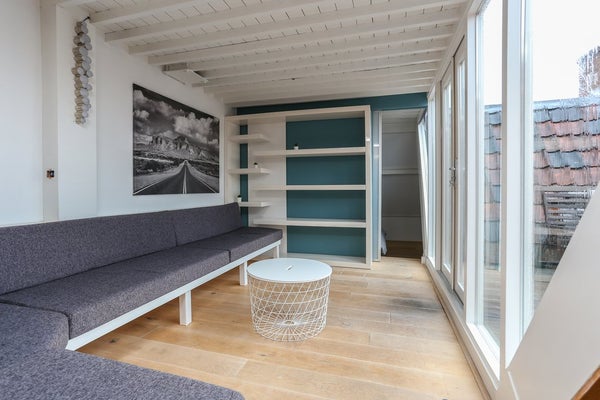 Derde verdieping: tweede woonkamer die ook zeer geschikt is als werkkamer. Vanuit hier heb je toegang tot het dakterras dat door haar zuidelijke ligging niet alleen lekker zonnig is maar ook een prachtig uitzicht geeft op de Dom. De tweede woonkamer geeft ook toegang tot een tweede slaapkamer met tweepersoonsbed en bergingsruimte.