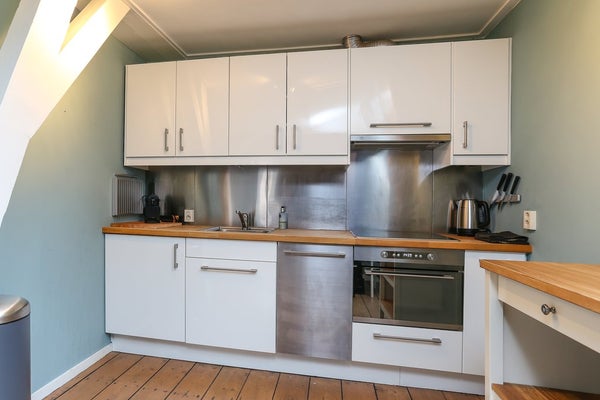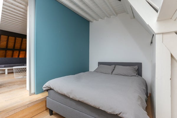Tweede verdieping: Entree, hal met toegang tot woonkamer, badkamer en ruime slaapkamer. De sfeervolle woonkamer met open haard heeft een 5m hoge nok en is direct verbonden met de open keuken. Deze biedt alle ruimte om lekker te koken en is voorzien van vaatwasser, combi-oven, kookplaat, afzuiger en inbouw koelkast. De luxe en smaakvol afgewerkte badkamer is voorzien van een bad, inloop-regendouche, wastafel en toilet. De slaapkamer heeft een tweepersoonsbed en veel kastruimte. Er is een aparte ruimte met wasmachine en droger. Via een trap in de woonkamer kom je uit op de derde verdieping.