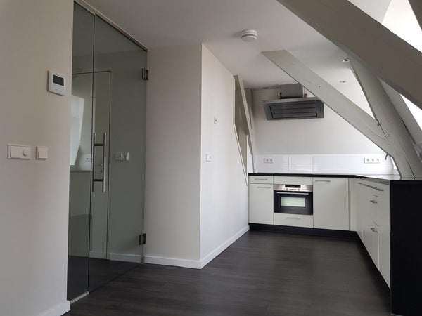 De luxe uitgevoerde open keuken is voorzien van vaatwasmachine, koel/vries-combinatie, inductiekookplaat, wasemkap, composieten aanrechtblad en dubbele wasbak. Vanaf de keuken heeft u een prachtig uitzicht op de Dom. Vanuit de woonkamer heeft u toegang tot de slaapkamer welke is voorzien van een ruime inbouwkast. Tevens geeft de woonkamer toegang tot een eventuele thuiswerk plek in de nok van de woning.