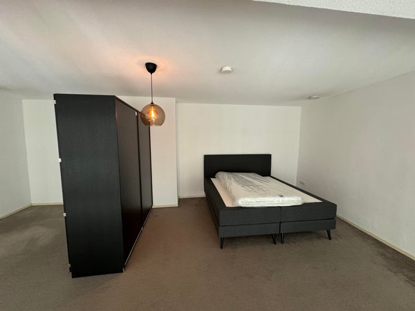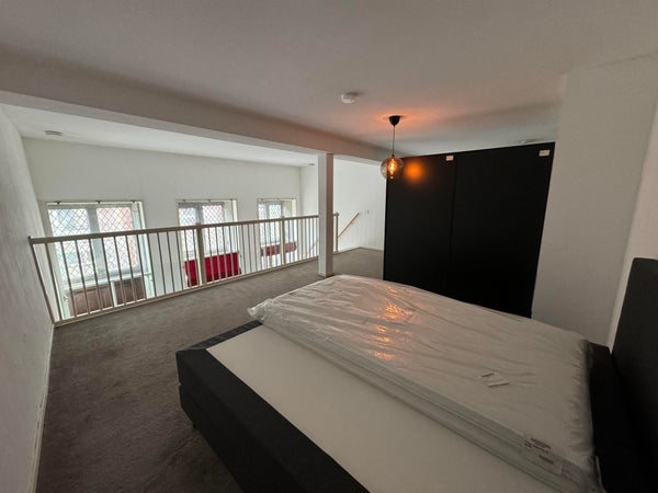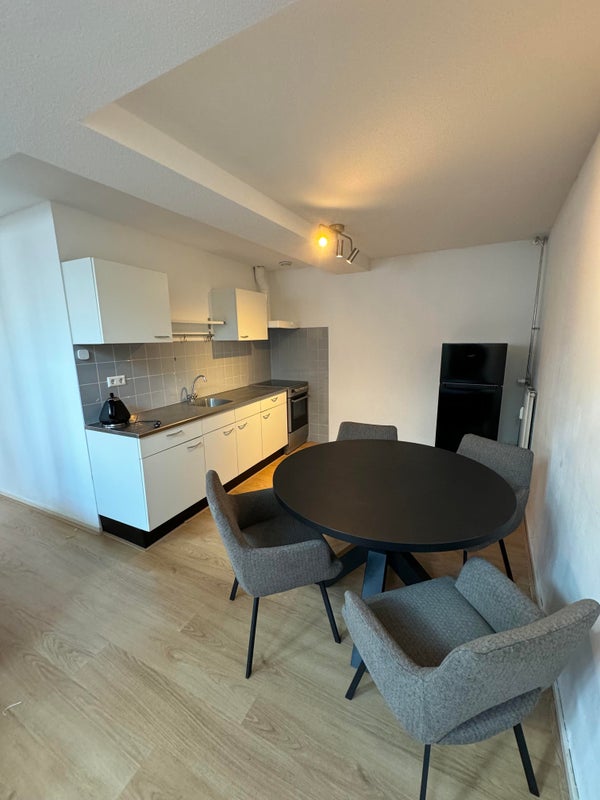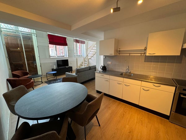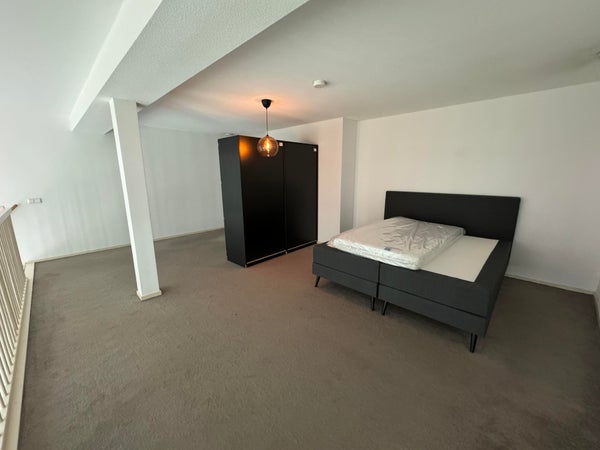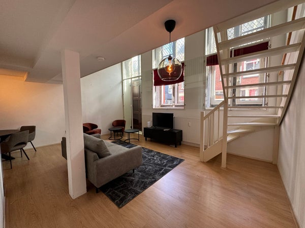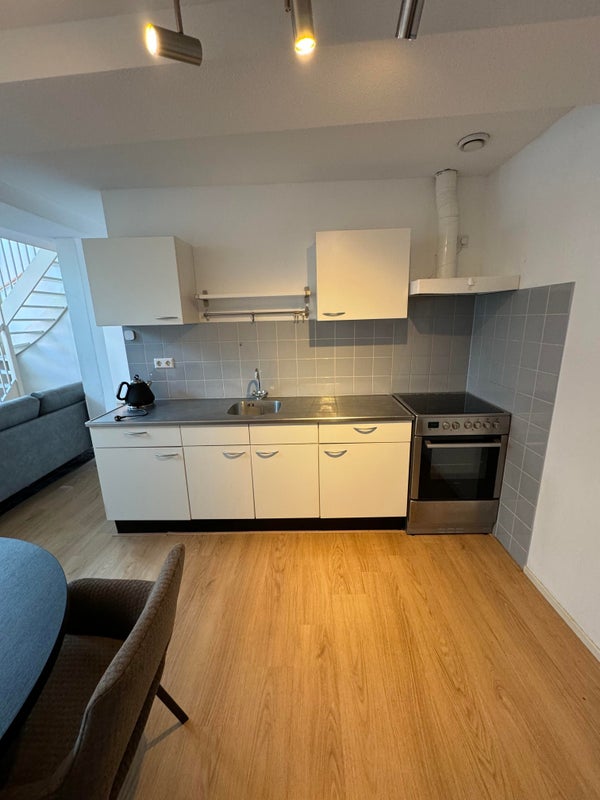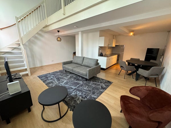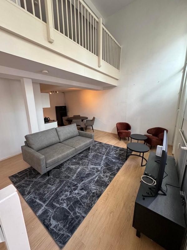 Een mooi en licht appartement bestaande uit een ruime woonkamer met open keuken, een badkamer en een ruime vide verdieping als slaapkamer.