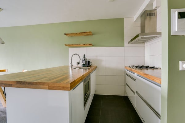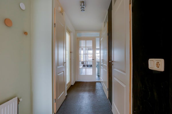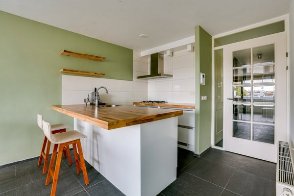 Entree, hal met meterkast, cv-ruimte met wasmachine, apart toilet, luxe badkamer, aan voorzijde ruimte lichte woonkamer met moderne open keuken voorzien van kookeiland/eetbar, 4-pits gasfornuis, combi-oven en koelkast, aan achterzijde ruime slaapkamer, tweede slaapkamer met openslaande deuren naar het balkon.