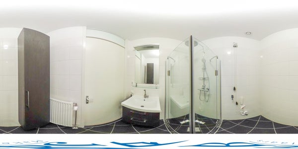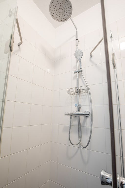 Badkamer met douche, wastafel en aansluiting voor een wasmachine