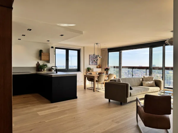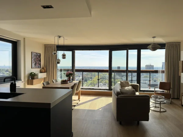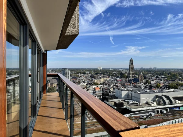 Te huur: een prachtig gerenoveerd 3 kamer penthouse in het centrum van Utrecht, hoog boven winkelcentrum Hoog Catherijne. Dit penthouse biedt fenomenaal uitzicht over het stadscentrum en de Domtoren vanuit de woonkamer en slaapkamers. Via de centrale entree zijn de liften naar de 17e verdieping bereikbaar. Daar leidt een gang naar het penthouse. De gang biedt toegang tot een garderobe, badkamer, aparte wc, bergkast, slaapkamer, werkkamer en ruime woonkamer met veel lichtinval. De moderne luxe keuken is uitgerust met inbouwapparatuur zoals een koelkast, vriezer, oven en vaatwasser. Het balkon is toegankelijk vanuit zowel de woonkamer als de werkkamer. Een bergkast met wasmachine en droger bevindt zich tegenover de ingang. Een parkeerplaats in de onderliggende garage is optioneel.