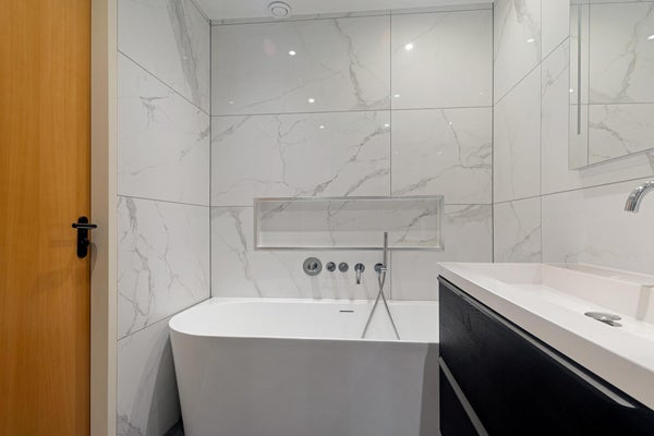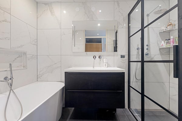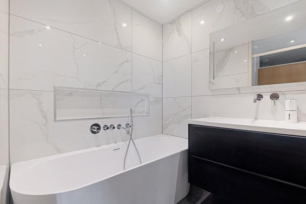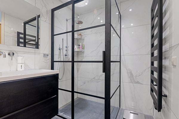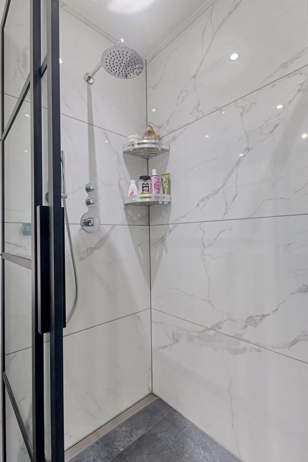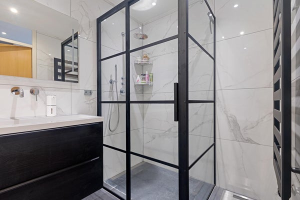 De grote badkamer biedt zowel een bad als een aparte inloopdouche, ontworpen voor ontspanning en gemak. Het appartement heeft een opslagruimte in het appartement voor de wasmachine, droger en centrale verwarmingsketel, plus voldoende opbergruimte. Een privé, grote opslagruimte en een gedeelde fietsenstalling in de kelder zijn ook beschikbaar.