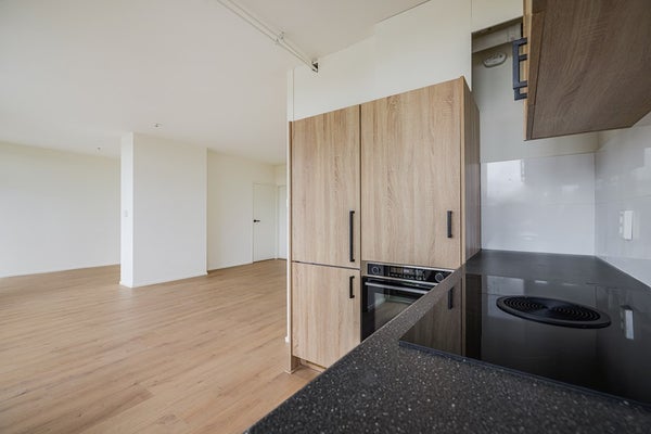 De keuken is voorzien van luxe inbouwapparatuur en is gunstig gepositioneerd: je kijkt naar buiten én staat in direct contact met de eethoek. Vanuit de woonkamer is er tevens toegang tot het toilet en de overige twee slaapkamers.