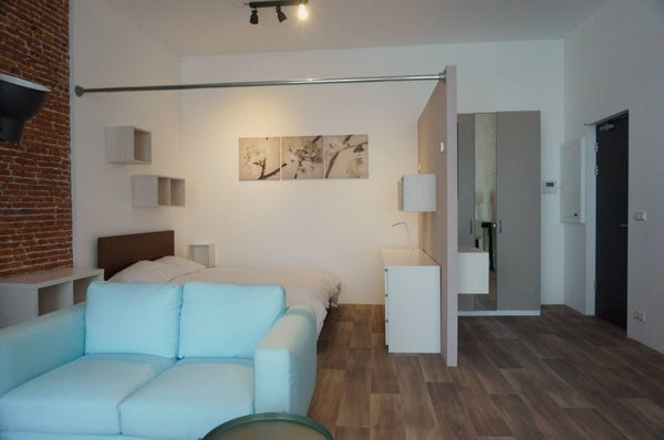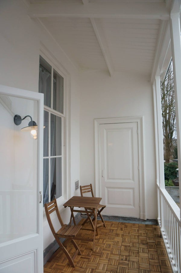 Entree via trappenhuis. Opgang naar de 1ste etage. Entree appartement. Garderobe, Video-intercom. Open woonkamer met klassieke schouw. Prachtige dubbele deuren naar overdekt balkon. Aangrenzend een half open slaapgedeelte met 2 persoonsbed (160cm x 200 cm).