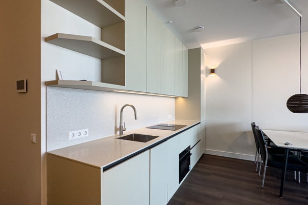 Vanuit de hal betreed je de ruime woonkamer met op maat gemaakte luxueuze open keuken, voorzien van hoogwaardige inbouwapparatuur. Door de grote raampartijen heb je een werkelijk schitterend uitzicht op de binnenstad. De woonkamer geeft toegang tot het ruime balkon. Vanuit de woonkamer kom je ook in de ruime slaapkamer met op maat gemaakte kasten. De badkamer is vanuit de slaapkamer te bereiken en is luxe en voorzien van wastafel met meubel en heerlijke ruime inloopdouche.