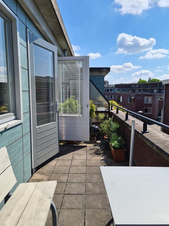 De ruime slaap- werkkamer heeft openslaande deuren naar het terras. Het terras is gelegen op het westen over de volle breedte (6 meter) van de woning, heeft een vrij uitzicht en is heerlijk zonnig.