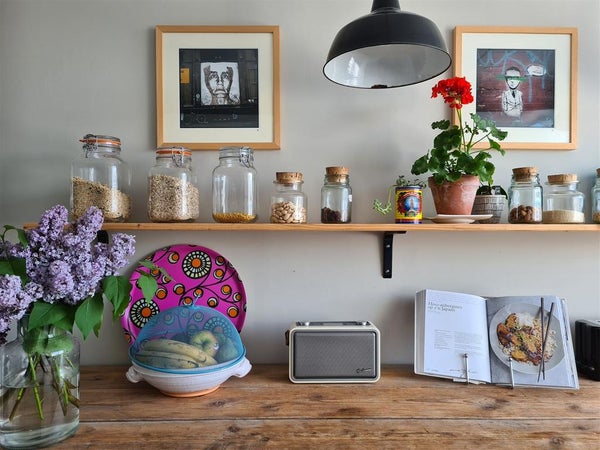 In de keuken vind je veel opbergruimte. Het donkere natuurstenen aanrechtblad is extra ruim. Verder zijn er een vier pits gasfornuis en moderne inbouwapparatuur (koel- vriescombinatie, grote oven met magnetronfunctie en vaatwasser) aanwezig. In overleg kan een rustieke houten bar van 2,5 lengte worden overgenomen. De keukenvloer bestaat uit Portugese cementtegels.