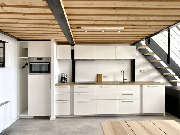 Entree appartement. Eerste toilet. Open keuken, met koelkast, vriezer, combi magnetron, inductie kookplaat, vaatwasser en afzuigkap. De woonkamer heeft 2 niveaus. Het lagere niveau grenst aan de keuken en vormt samen een woonkeuken. Het hogere deel is voor het zitgedeelte waardoor u fraai uitzicht heeft door de hoge raampartijen. Onder het verhoogde zit gedeelte zitten een paar verrassende opberg ruimte, waaronder een uitschuifbare lade waar zomaar een 0,5 m3 aan schoenen in past! Via een trap in de woonkamer de slaapkamer op de entresol, Een fraaie aangrenzende badkamer met wastafel en inloopdouche.