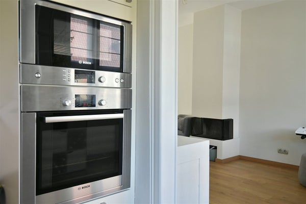 Overloop, modern hangend toilet met fonteintje, ruime en lichte woonkamer met open haard en openslaande deuren naar het balkon, moderne open keuken voorzien van diverse inbouwapparatuur, te weten: koelkast, vriezer, 6 pits gaskookplaat, rvs afzuigkap, vaatwasser, magnetron en heteluchtoven.