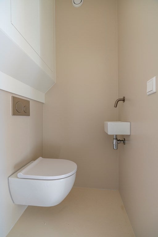 De smaakvolle badkamer is modern afgewerkt en voorzien van een inloopdouche, wastafelmeubel, handdoekradiator en wederom hoogwaardige materialen. Het separate toilet met fonteintje is in dezelfde stijl uitgevoerd.