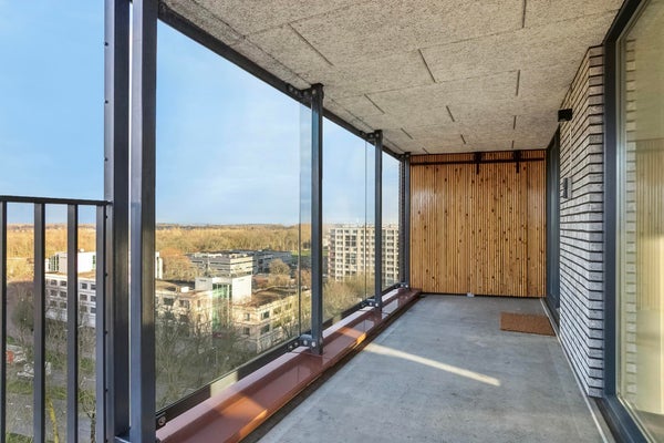 14 m² breed balkon op het noordoosten, deels overdekt en met glazen panelen. Fantastisch uitzicht en geschikt voor zitjes of een eettafel. Extra buitenbergruimte aanwezig.