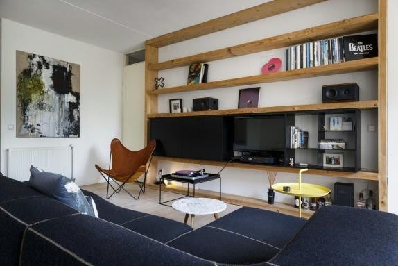 Naast de keuken bevindt zich een inpandige berging met efficiënte inbouwkast. Hier bevindt zich de opstelplaats voor de wasmachine en droger. Tevens is hier de c.v. combiketel geplaatst. De oppervlakte van de woonkamer (incl. keuken) bedraagt ca. 40 m2.