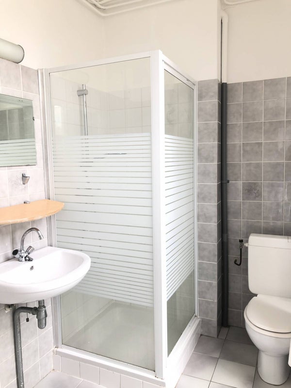 Badkamer met douche, wastafel en toilet.